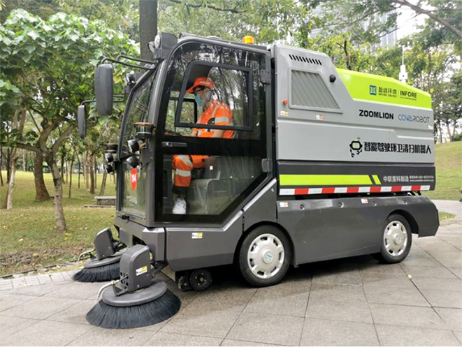 在深圳中心区的市民广场,一辆无人驾驶智能环卫清扫车,沿着道路一边缓缓行进,一边用前侧两个旋转式扫把清扫落叶和纸屑。“它配备了智能清扫系统,可以自主完成路面的清扫、洒水、垃圾收集等工作。”深圳盈联城市环境服务有限公司经理范家瑞说,一辆充满电的智能环卫机器人可以陆续在工作8.5个小时。这辆车顺利获得5G后台传输数据到机器,提前设置清扫路径。“现在是每天上午清扫两趟,下午一趟,无需人工干预,快没电的时候,清扫车会自己到自动充电点等待充电。”